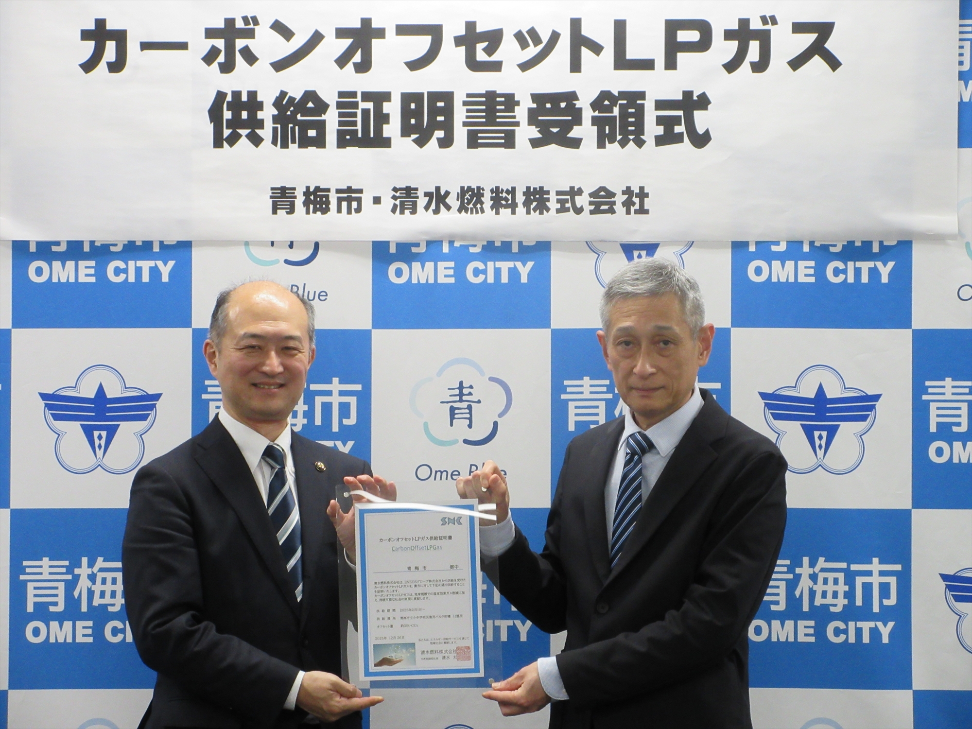 清水燃料(東京都青梅市、清水大社長)は、青梅市(大勢待利明市長)に対するカーボンオフセットLPガス(COLPG)の供給を開始した。12月26日、青梅市役所で証明書の受領式が行われ、清水社長が大勢待市長に証明書を手渡した。受領式には清水燃料の清水真人・今井充填所長のほか、清水燃料にカーボンオフセットLPガスを供給しているENEOSグローブ(東京都千代田区、小西徹社長)からは鈴木達之東京支店長、阿部伸貴東京支店副所長が臨席した。証明書の対象は、一次避難所に指定されている青梅市立の小中学校11校に設置された980㎏縦型の災害バルクのLPガス。バルク設置先の小中学校にはLPガス発電機も置かれ、カーボンオフセットLPガスは避難所の空調設備や照明用の電気を作るのに使われる。11校への供給によるCO2オフセット量は約35t-CO2。