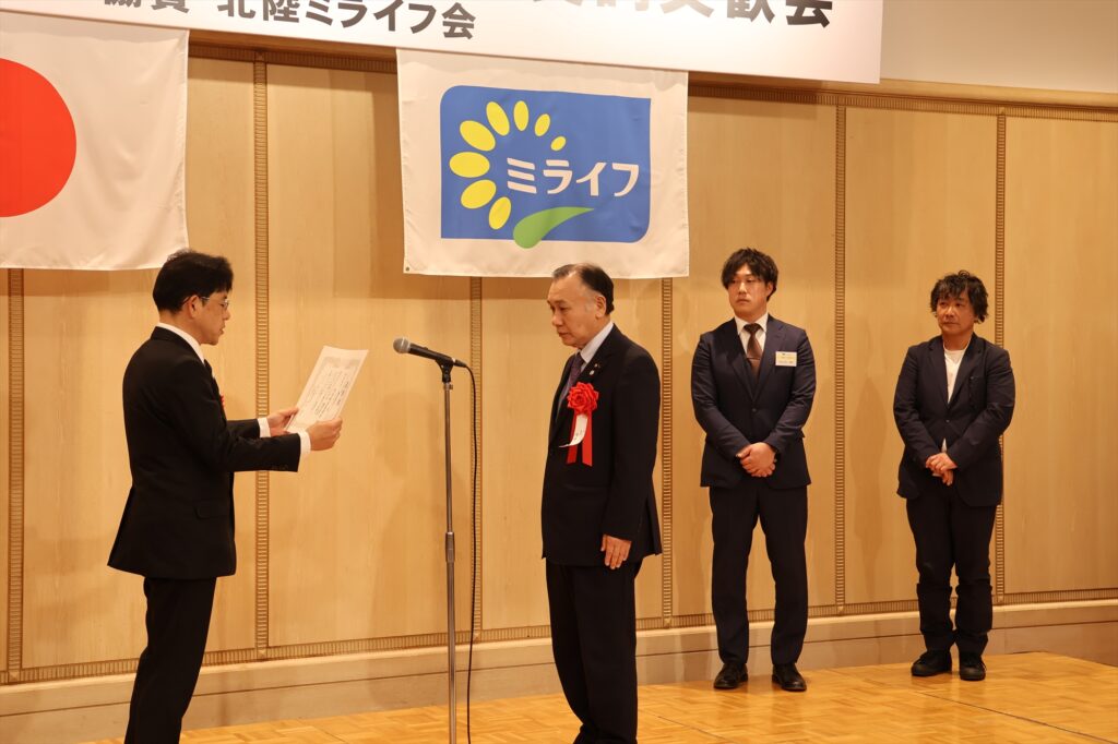 ミライフ西日本金沢支店(輪木正明支店長)は9日、金沢市のホテル日航金沢で新年賀詞交歓会を開いた。北陸ミライフ会(作井善継会長)の協賛で販売店の代表者らが出席した。輪木支店長の開会あいさつの後、ミライフ西日本の中川進弘社長が登壇し、今年の方針について説明。来賓からは、アストモスエネルギー北陸支店の相馬健洋支店長が祝辞を述べた。機器販売コンテストの表彰式も行った。