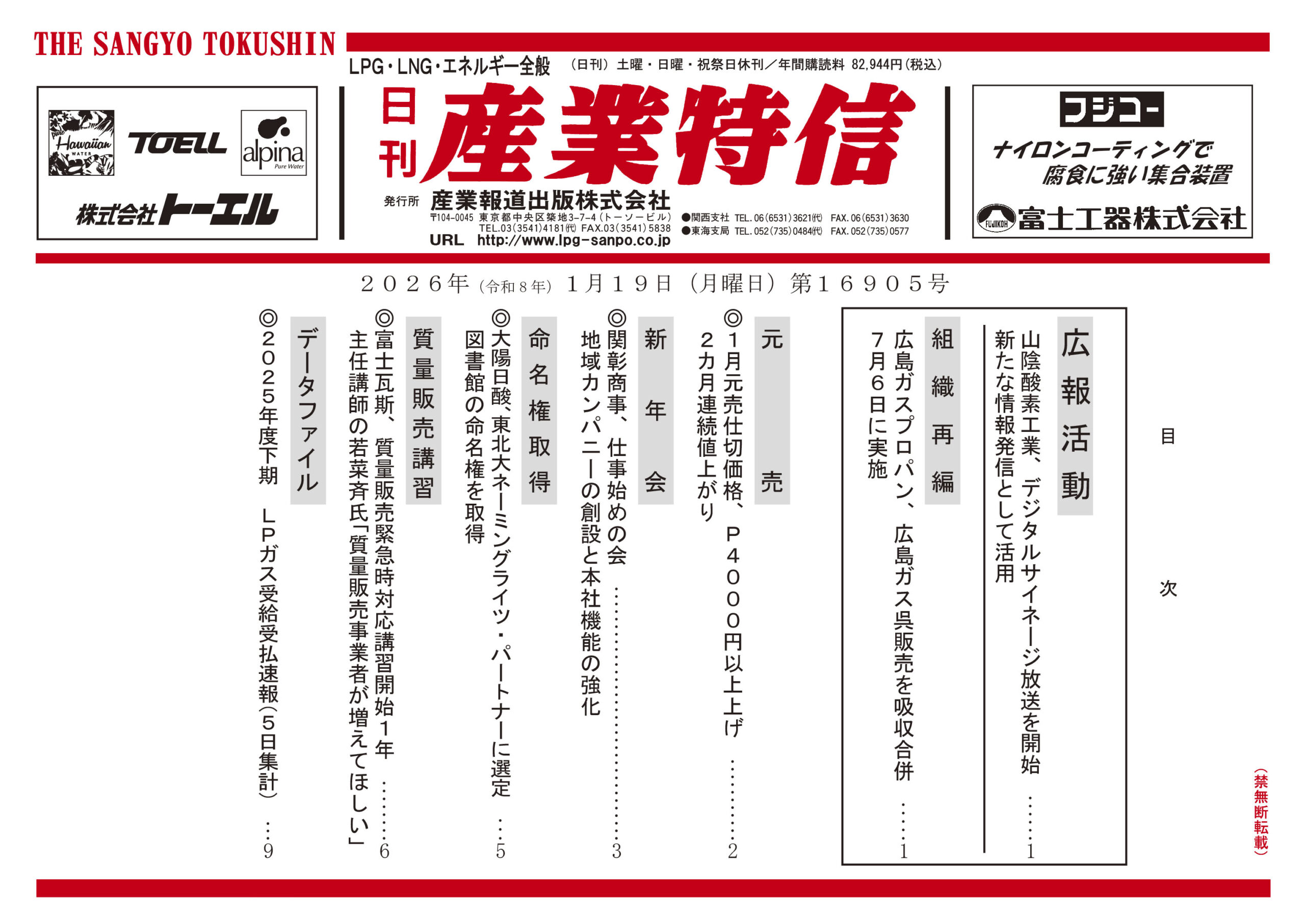 2026年(令和8 年)1月19日(月曜日)第16905号 バックナンバー X Facebook LINE 2026.01.19 ダウンロードには会員登録が必要です。 記事の続きの閲覧は会員(定期購読者)のみに制限されています。全文を読むには ログイン してください。