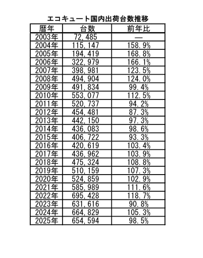 日本冷凍空調工業会(JRAIA)集計の自主統計によると、2025年(1~12月)のエコキュート(家庭用ヒートポンプ給湯器)国内出荷台数は、前年から1・5%減の65万4594台だった。