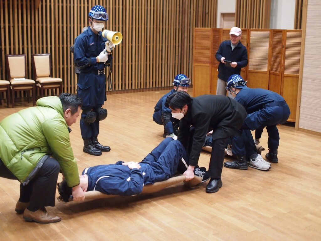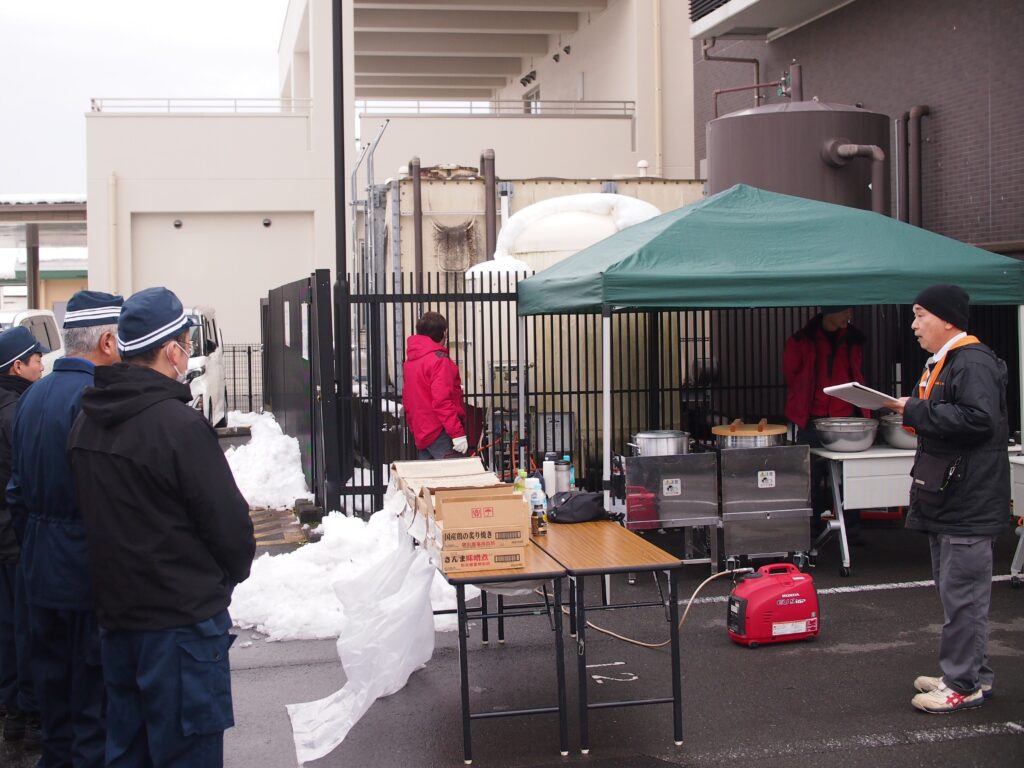 村上商事(京都府福知山市、村上俊英社長)は1月27日、グループ運営の福知山サンホテルで地元の福知山警察署(建井秀之署長)と合同の震災訓練を行った。福知山警察署がエアテントの設営や要救助者の搬送訓練、村上商事は設置している1トン型災害対応バルクを使って炊き出しや発電などの設営、運営を行った。