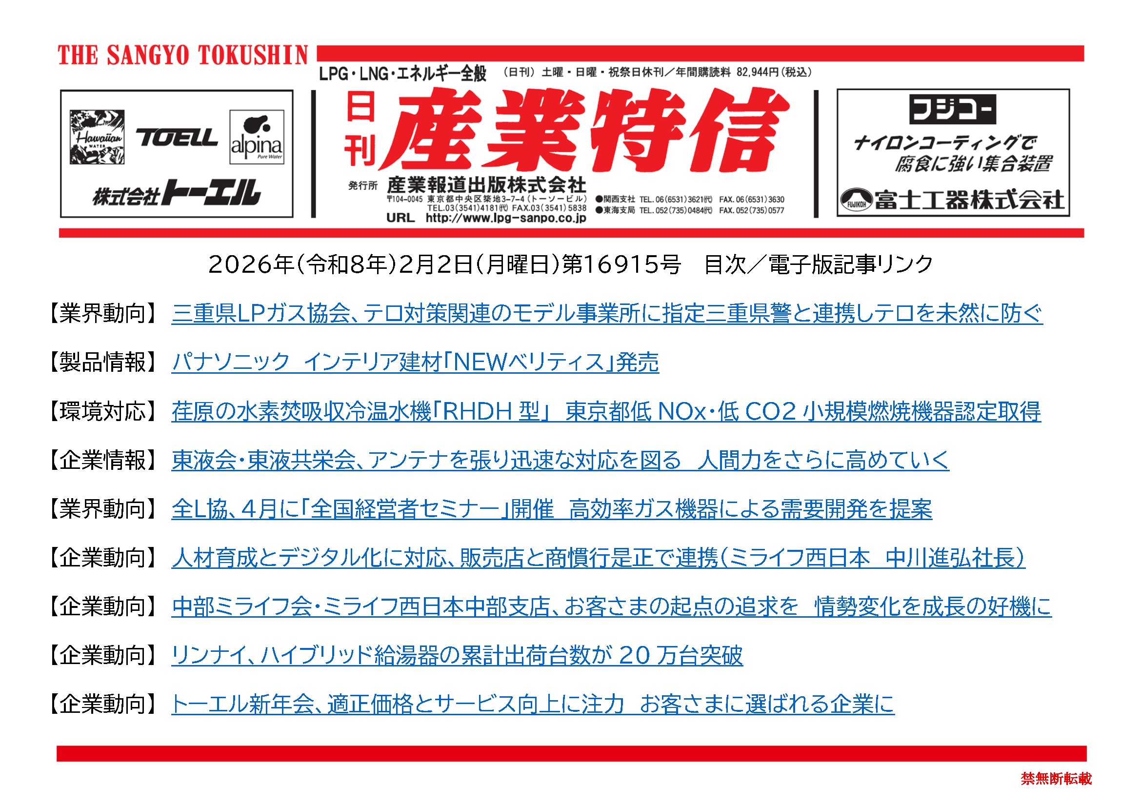 2026年(令和8年)2月2日(月曜日)第16915号 バックナンバー X Facebook LINE 2026.02.02 ダウンロードには会員登録が必要です。 記事の続きの閲覧は会員(定期購読者)のみに制限されています。全文を読むには ログイン してください。