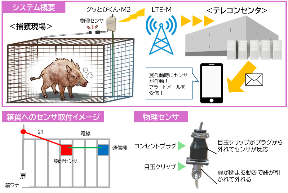 監視の仕組みは、罠の扉が閉まった際の動きを物理センサが検知し、LTE-M回線を通じてテレコンセンタへ通知するもの。作動時には即座にアラートメールが送信されるため、捕獲後の迅速な対応が可能となる。