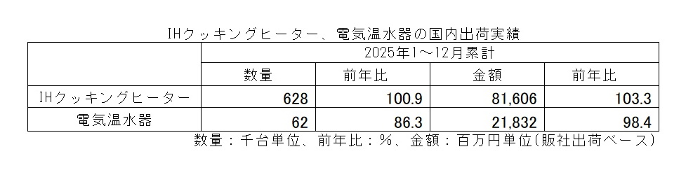 日本電機工業会(JEMA)が集計した民生用電気機器自主統計調査によると、2025年1~12月のIHクッキングヒーター国内出荷実績は、前年同期比0・9増の62万8000台だった。電気温水器の国内出荷実績は、同13・7%減の6万2000台。