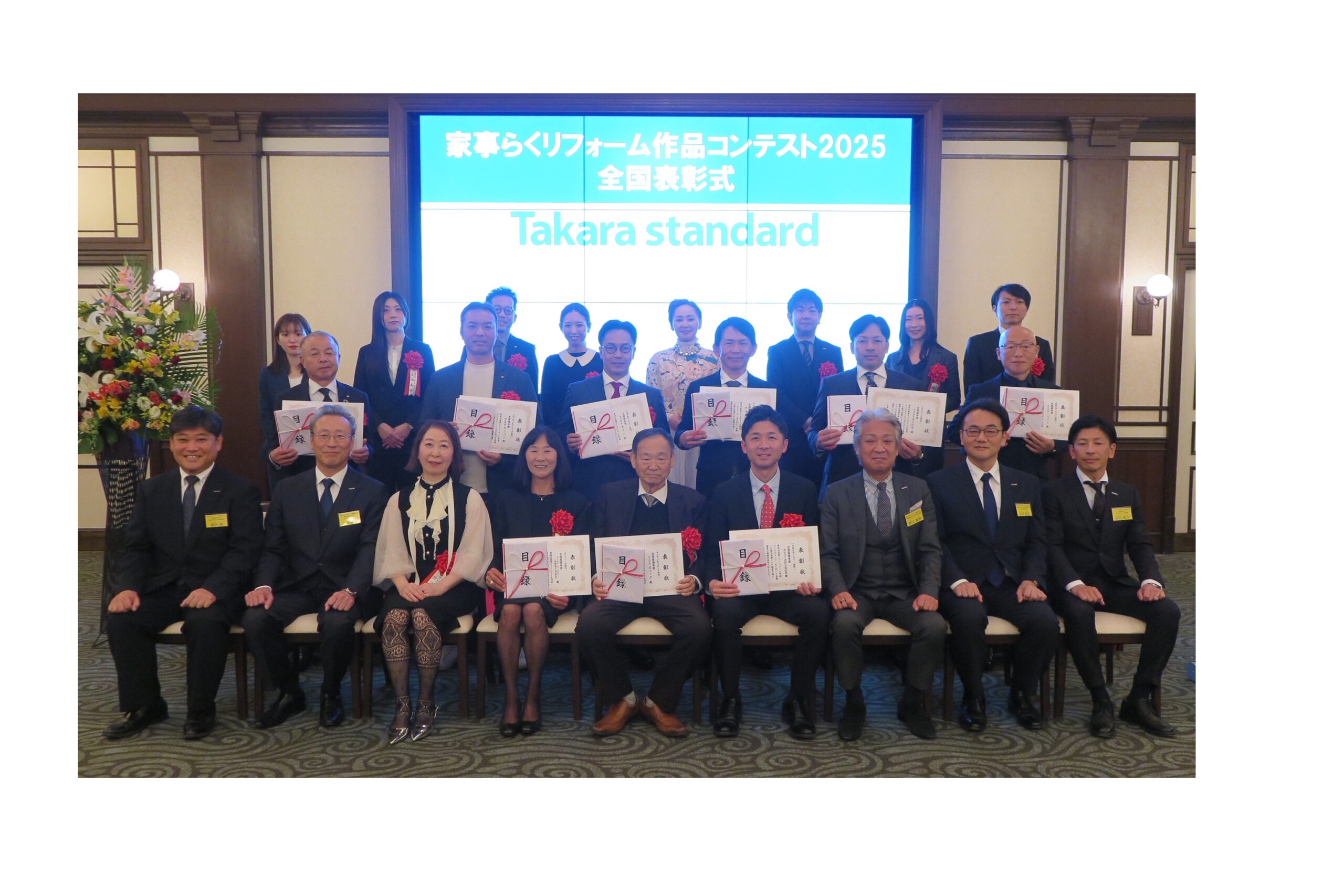 タカラスタンダード(大阪市、小森大社長)は10日、大阪市のホテルモントレ大阪で、「第7回家事らくリフォーム作品コンテスト2025」の全国表彰式を開催した。全国約3000店舗の「タカラスタンダードパートナーショップ加盟店」から約2000作品の応募があり、「キッチン&リビング部門」「浴室&サニタリー部門」「エマウォール部門」の3部門で、それぞれ最優秀賞1作品、優秀賞2作品の計9作品を選出した。