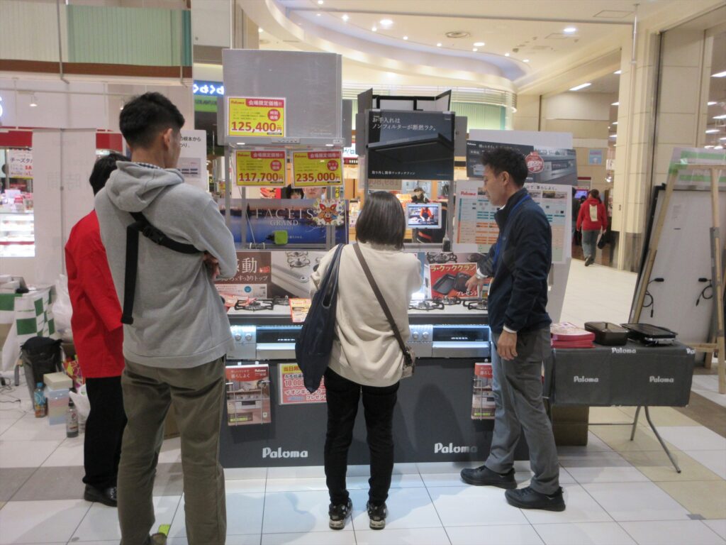 ガスコンロに興味津々の来場者