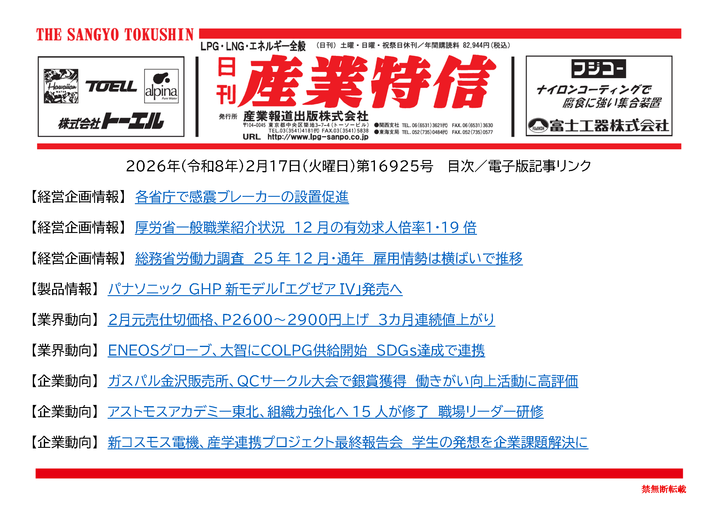 2026年(令和8年)2月17日(火曜日)第16925号 バックナンバー X Facebook LINE 2026.02.17 ダウンロードには会員登録が必要です。 記事の続きの閲覧は会員(定期購読者)のみに制限されています。全文を読むには ログイン してください。