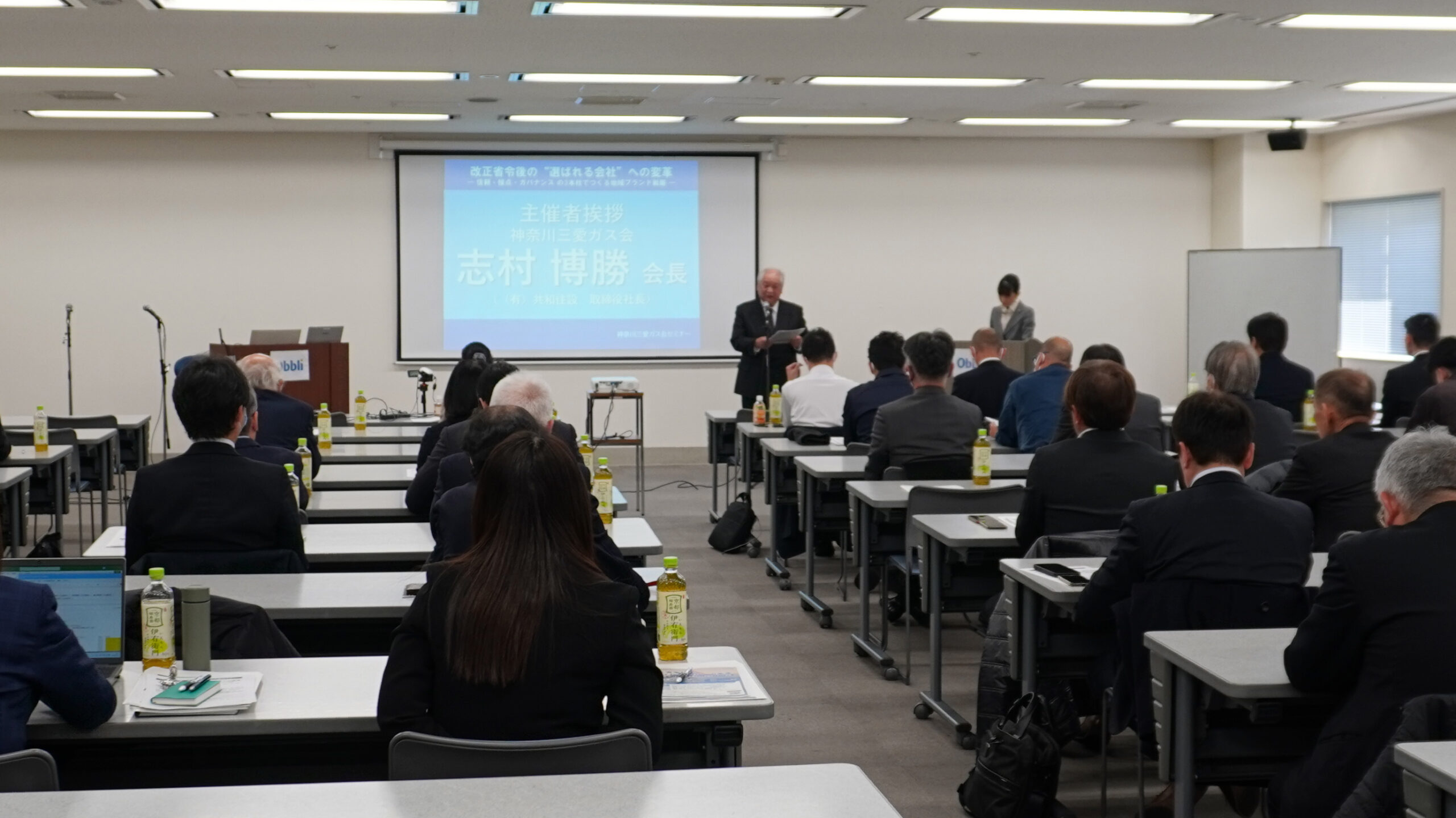 三愛オブリガス東日本(清水幸一社長)の特約店で組織される神奈川三愛ガス会(志村博勝会長)は2月19日、横浜市内の三共横浜ビルで「2025年度 神奈川三愛ガス会セミナー」を開催した。同セミナーは毎年、会員企業のほか、首都圏の同業他社にも広く参加を呼び掛けて開催され、同日は約50社が参加した。