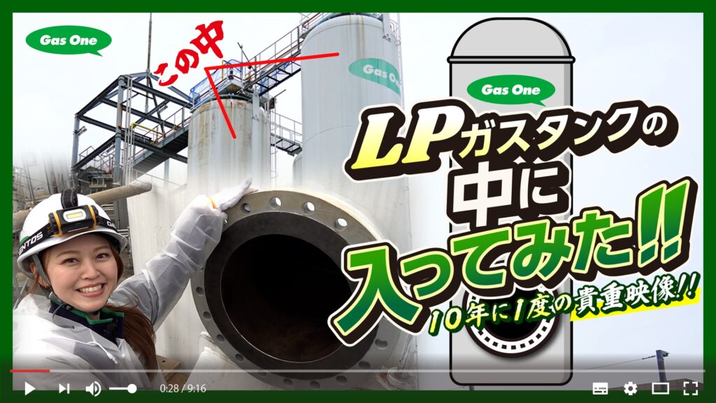 検査対象は、直径3.5m、高さ17m、貯蔵能力65tを誇る巨大なLPガス貯蔵タンク。10年に一度行われるこの貴重な点検のタイミングに合わせ、GasOneパーソナリティの「りなりな」さんがタンク内部へ潜入した。動画では、暗所となったタンク内で天井まで組み上げられた足場を登り、点検の最前線をレポートしている。