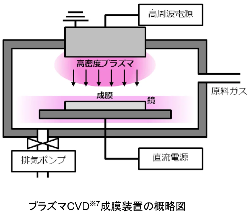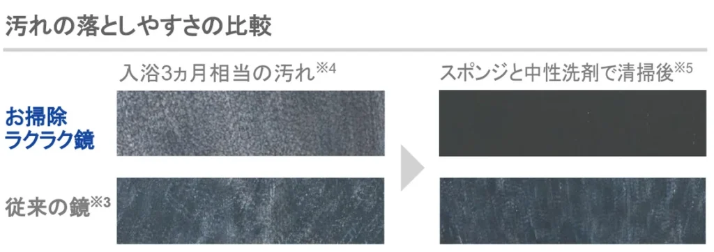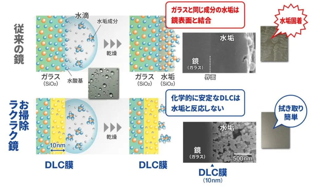 鏡へのDLC成膜は前例がなく、水垢除去に効果的な組成や成膜方法、専用の生産設備を装置メーカーと共同開発した。グループ会社のTOTOマテリア土岐工場(岐阜県土岐市)にDLC成膜ラインを構築し、生産開始から10年で累計200万枚以上の「お掃除ラクラク鏡」を出荷した実績がある。