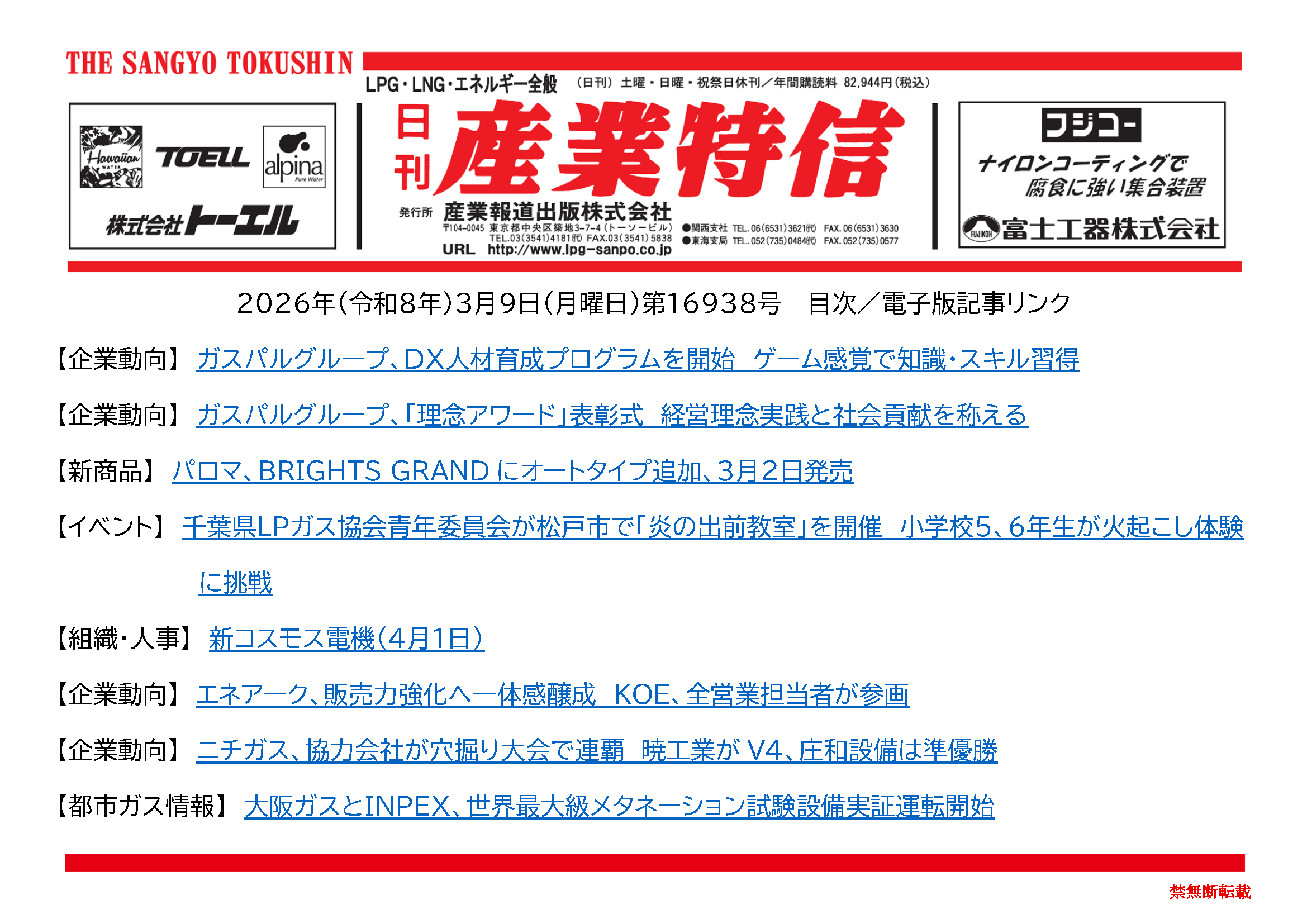 2026年(令和8年)3月9日(月曜日)第16938号 バックナンバー X Facebook LINE 2026.03.09 ダウンロードには会員登録が必要です。 記事の続きの閲覧は会員(定期購読者)のみに制限されています。全文を読むには ログイン してください。