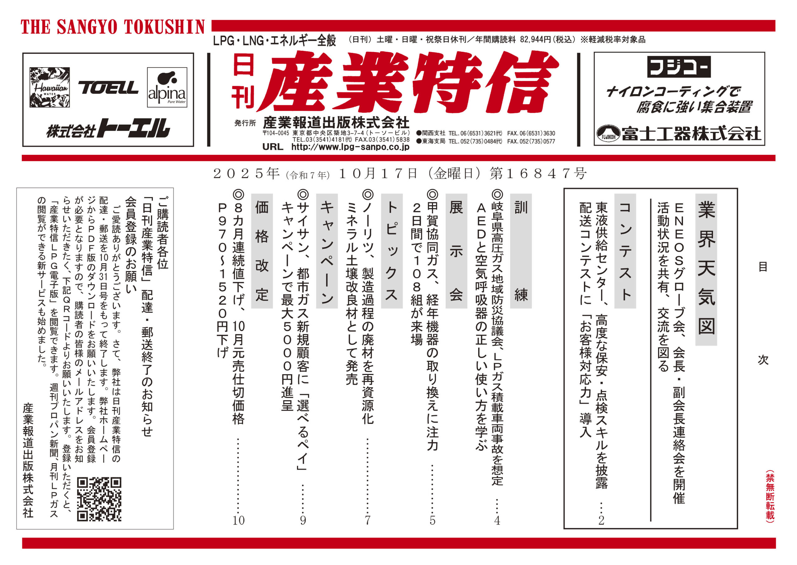 2025年(令和7 年)10月17日(金曜日)第16847号 バックナンバー X Facebook LINE 2025.10.17 ダウンロードには会員登録が必要です。 記事の続きの閲覧は会員(定期購読者)のみに制限されています。全文を読むには ログイン してください。