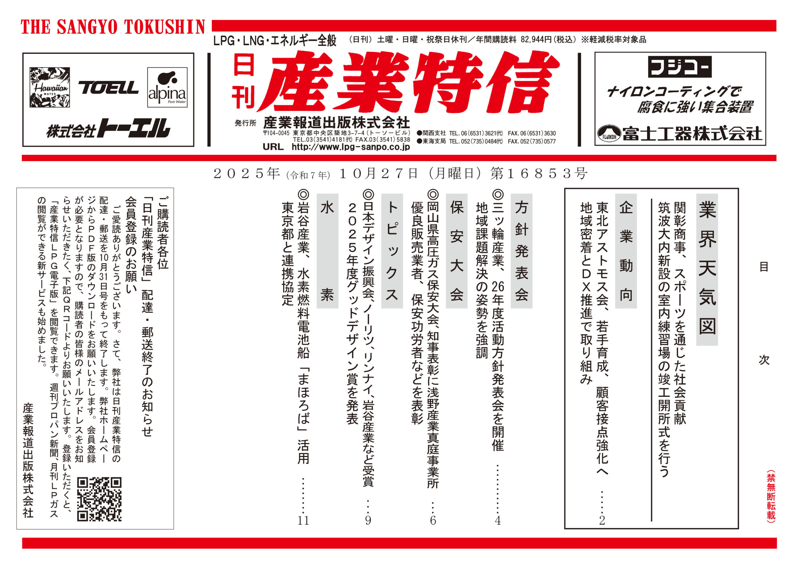 2025年(令和7 年)10月27日(月曜日)第16853号 バックナンバー X Facebook LINE 2025.10.27 ダウンロードには会員登録が必要です。 記事の続きの閲覧は会員(定期購読者)のみに制限されています。全文を読むには ログイン してください。