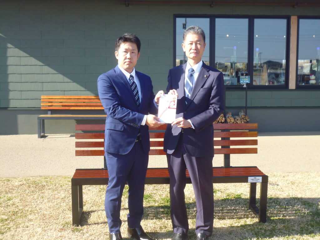 千葉県LPガス協会青年委員会(片岡大輔委員長)は12月17日、館山市の「道の駅グリーンファーム館山」にベンチ1台を寄贈した。同日、同施設で行われた贈呈式には、千葉県協青年委から小沢晶太氏、鈴木徹平氏が出席。館山市からは森正一市長、石井副市長ら関係者が参加した。