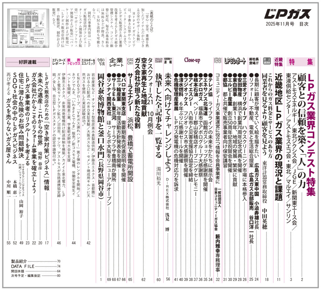 月刊LPガスは昭和34年の創刊以来、常に業界のニーズ に応え、業界発展のための正しい指針を提示すべく努めているLPガス業界唯一の月刊専門誌です。ガスエネルギーから 住設機器まで幅広い情報を網羅し、実益中心の編集方針で発行しています。本誌では保安関連、DX関連情報、 流通(小売業)情報、都市ガス情報、電力関連情報の充実に力を注いでいます。